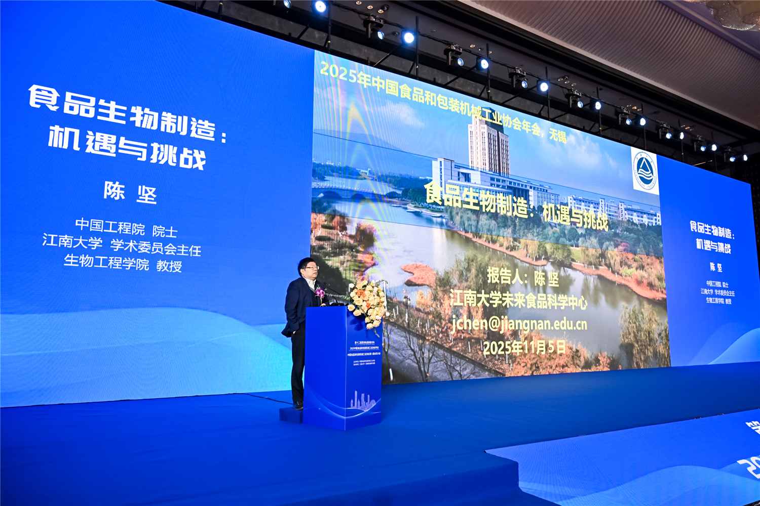 院士、江南大学学术委员会主任陈坚,围绕“食品生物制造技术的创新与应用”,指出该技术是食品工业在数智融合趋势下转型升级的关键,通过前沿技术可实现食品原料定制化生产和营养价值提升,推动行业向新发展。