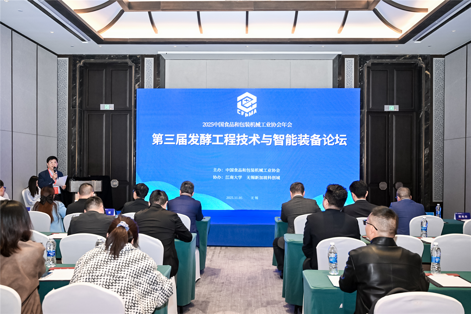 11月5日上午,年会开幕式在无锡融创施柏阁酒店会议中心大宴会厅隆重举行。大会在庄严的国歌声中隆重开幕,开幕式由中国食品和包装机械工业协会秘书长崔林主持,中国食品和包装机械工业协会党支部书记、监事长、专务楚玉峰,中国食品和包装机械工业协会理事长、中国包装和食品机械有限公司党委书记周,无锡市政府副市长张镇,江南大学党委书记吴正国出席开幕式并致辞,共同擘画行业在数智融合背景下聚力向新的未来发展蓝图。