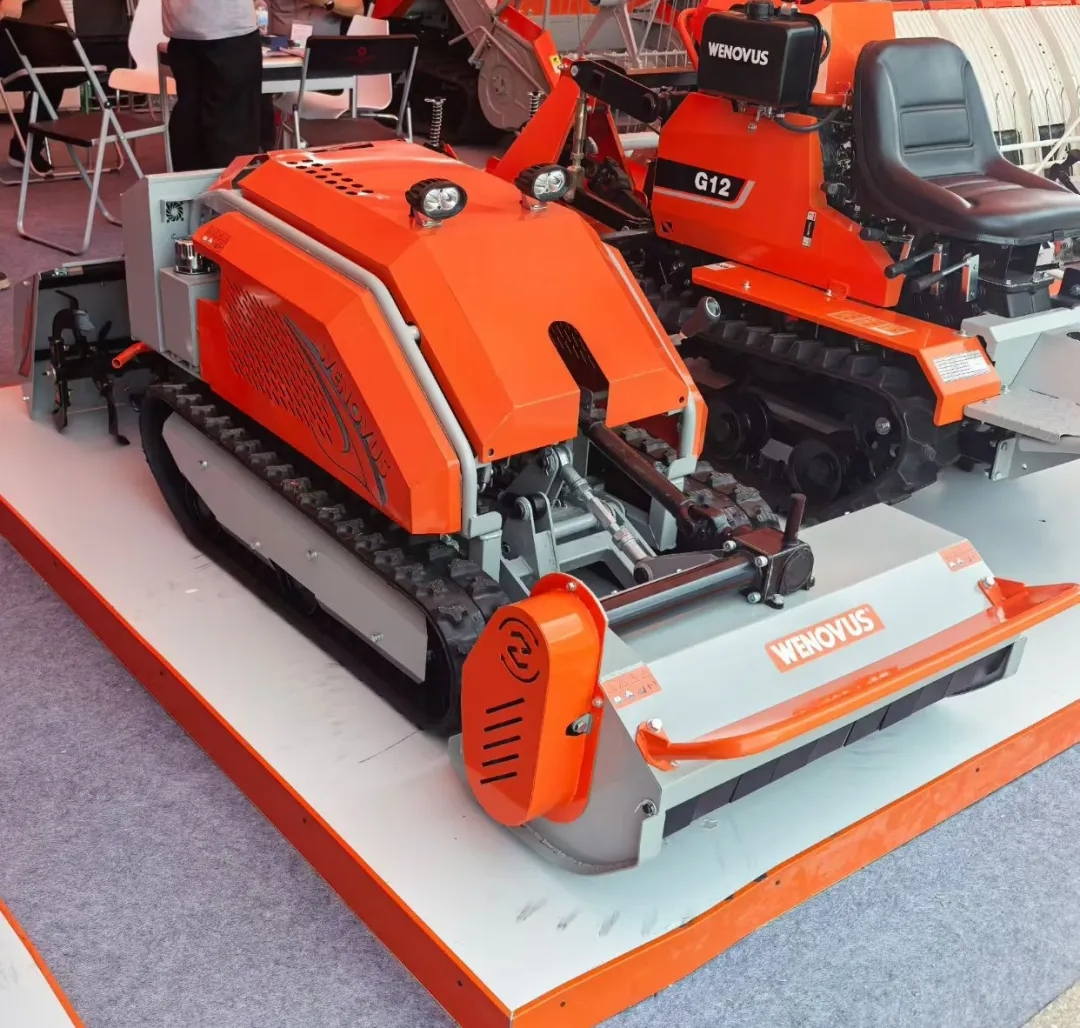 WENOVUS遥控割草机,凭借自主核心技术成为全场焦点:常开离合安全可靠,100米超距遥控精准灵敏(支持原地掉头),履带行走无惧复杂地形,并可扩展旋耕、开沟等多种附件。