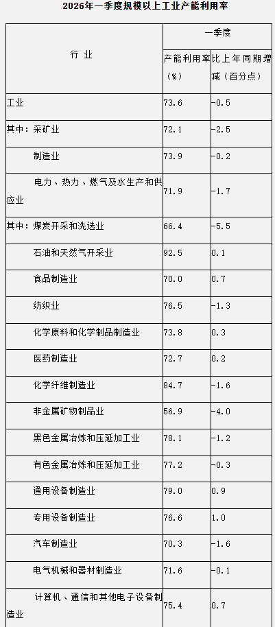 分三大门类看,2026年一季度,采矿业产能利用率为72.1%,制造业产能利用率为73.9%,电力、热力、燃气及水生产和供应业产能利用率为71.9%。