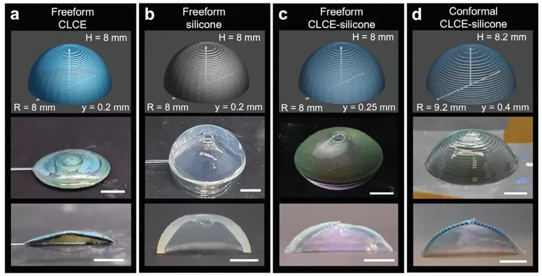 5. 由CLCE、硅胶和CLCE - 硅胶打印的穹顶,分别尝试用CLCE、硅胶和CLCE - 硅胶墨水打印穹顶结构,研究重力对打印的影响以及不同打印方式的效果。结果显示,CLCE墨水单独打印多层时会失形,硅胶墨水可打印空心3D结构,CLCE - 硅胶墨水自由打印穹顶受重力影响厚度不均且为单稳态,而在穹顶基板上共形打印可制备出厚度均匀的双稳态穹顶,其不同面在应力下呈现不同颜色变化。