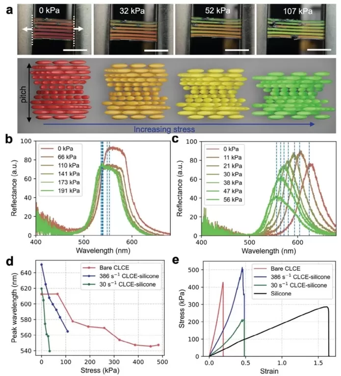 4. 打印的CLCE - 硅胶棒的机械变色性能,将打印的CLCE - 硅胶棒样品置于拉伸试验机中,用光谱仪测量反射率,研究其机械变色性能和力学性能。结果表明,施加拉伸应力时,样品反射波长蓝移,CLCE - 硅胶的机械变色灵敏度高于裸CLCE,且随CLCE剪切速率增加而降低;CLCE - 硅胶的断裂应变比裸CLCE大得多,这归因于柔软且有弹性的硅胶壳,其能减轻CLCE弹性差的负面影响。