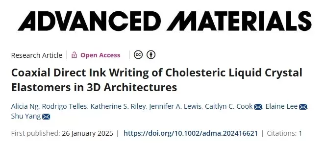 为解决这些痛点,来自宾夕法尼亚大学的Shu Yang教授,哈佛大学的Jennifer A. Lewis教授,以及劳伦斯利弗莫尔国家实验室的Caitlyn C. Cook教授和Elaine Lee教授团队合作,开发了一种同轴DIW方法。他们使用低粘度、快速取向的CLC墨水作为核心材料,透明、具有屈服应力的有机硅墨水作为外壳材料,成功制备出3D CLCE - 有机硅结构。这种方法无需有机溶剂和退火步骤,所制备的双稳态薄壳穹顶结构展现出良好的机械变色性能和物理记忆特性。相关工作以“Coaxial Direct Ink Writing of Cholesteric Liquid Crystal Elastomers in 3D Architectures”为题发表在《Advanced Materials》上。