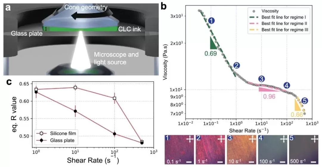 2. 剪切作用下胆甾相的形成,利用配备原位偏振光显微镜(POM)的流变仪,在反射模式下对红色CLC墨水进行不同剪切速率处理,研究剪切速率对CLC取向的影响。结果显示,CLC墨水存在三个流动区域,不同剪切速率下呈现不同相态和颜色变化。在0.1 - 10s⁻¹时,墨水形成胆甾相,10s⁻¹时红色平衡值,此时取向;100 - 500s⁻¹时出现流动诱导向列相,停止剪切后胆甾相快速形成,且硅胶能改善CLC取向,确定剪切速率范围为1 - 100s⁻¹。