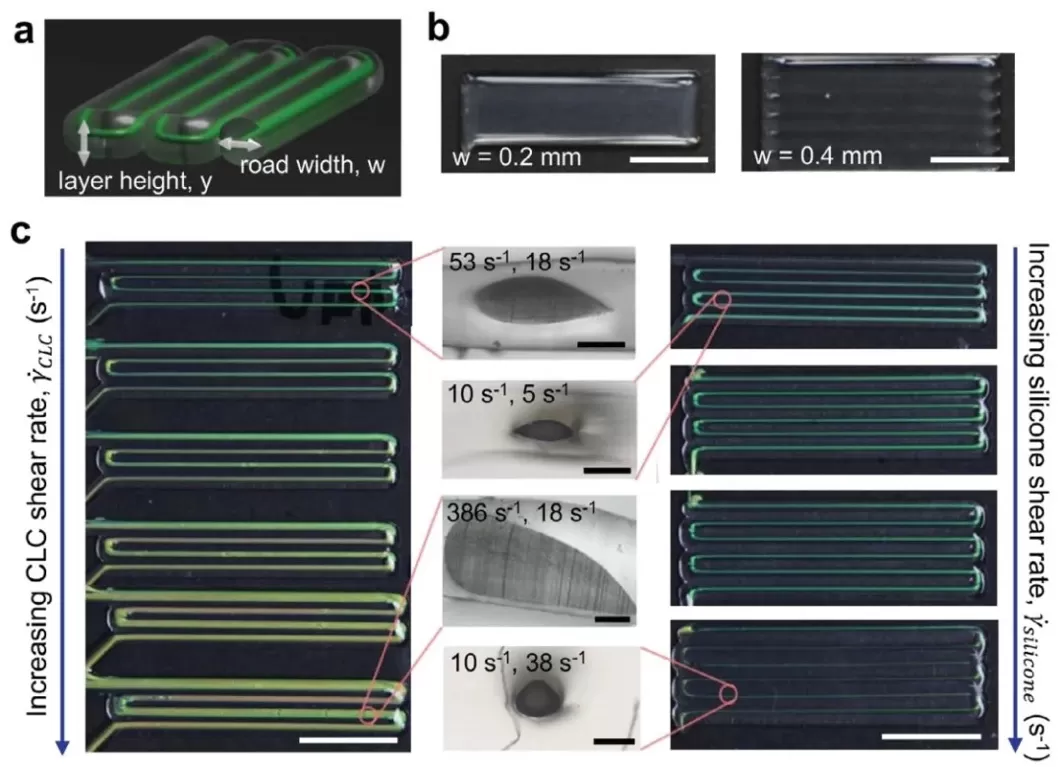 3. 剪切速率对打印保真度的影响,通过以恒定速度打印CLCE - 硅胶棒,改变CLCE和硅胶墨水的剪切速率,研究其对打印结构的影响。结果表明,增加CLCE剪切速率会使长丝的CLCE与硅胶体积比增大,导致核心不对称、颜色不均匀;增加硅胶剪切速率虽可使核心更对称,但会使颜色难以观察。综合考虑,多层且颜色鲜艳的CLCE - 硅胶厚膜的打印条件为硅胶剪切速率5 - 26s⁻¹、CLCE剪切速率10 - 100s⁻¹,同时硅胶壳能防止打印缺陷。