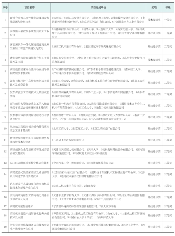 获奖项目涵盖金属切削技术、金属成形技术、铸造机械、切削刀具、功能部件和自动控制系统五大领域。其中,切削刀具、数控系统与功能部件类项目共计7项,占比37%,反映出我国在机床核心部件领域的持续突破。