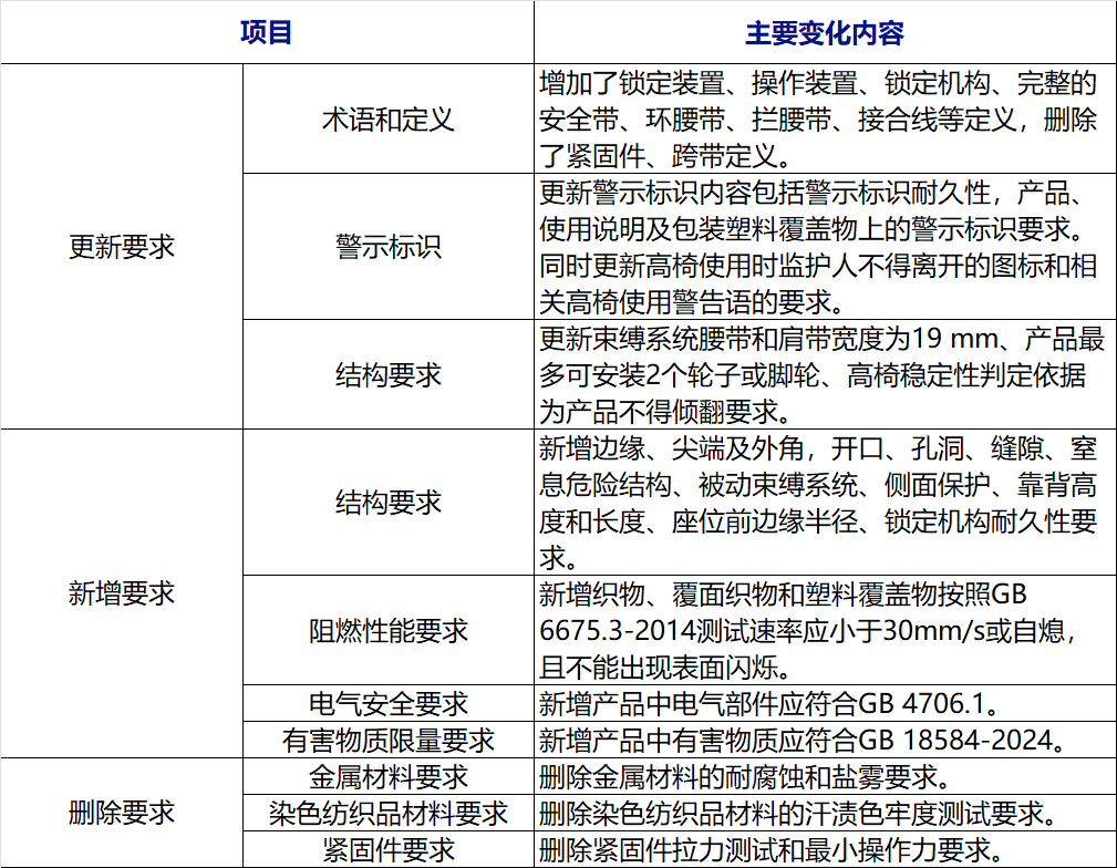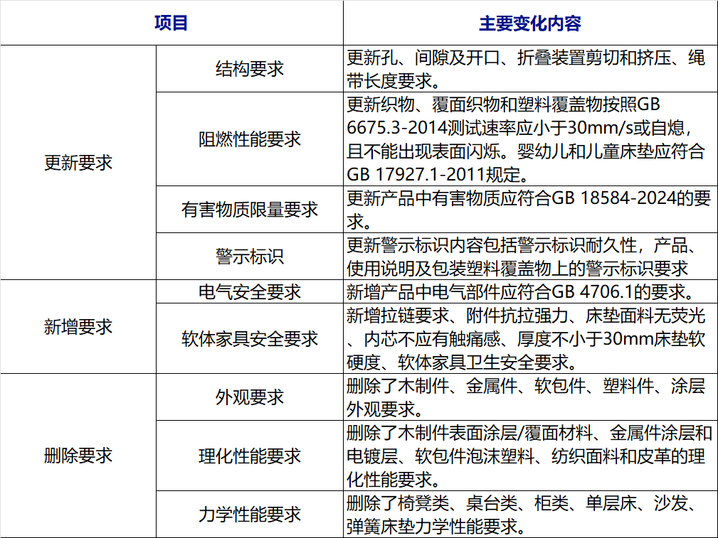 相较于GB 28007-2011《儿童家具通用技术条件》主要变化如下: