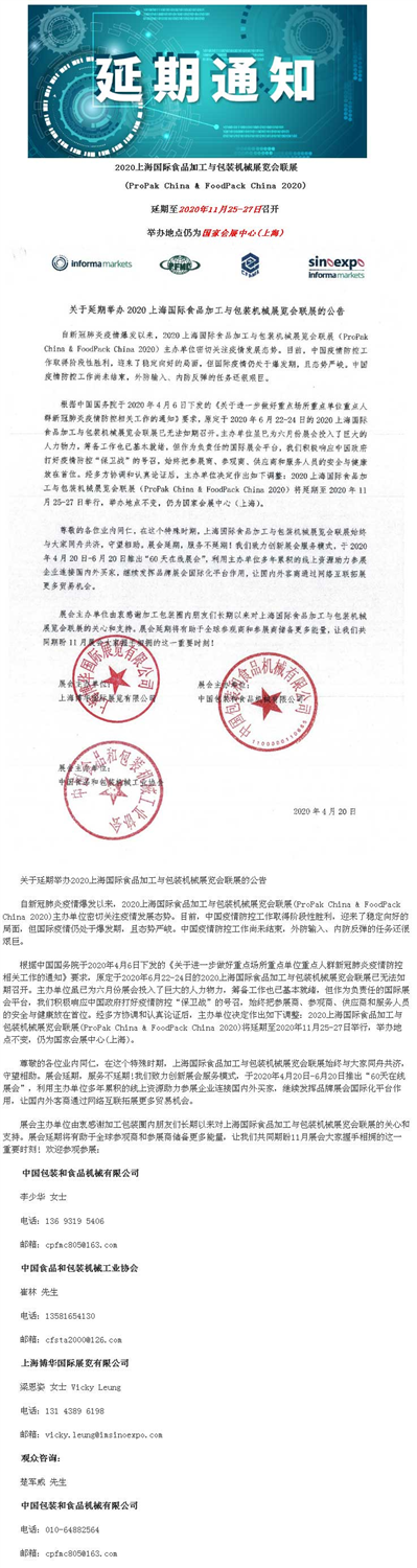 2020上海国际食品加工与包装机械展览会联展延期公告