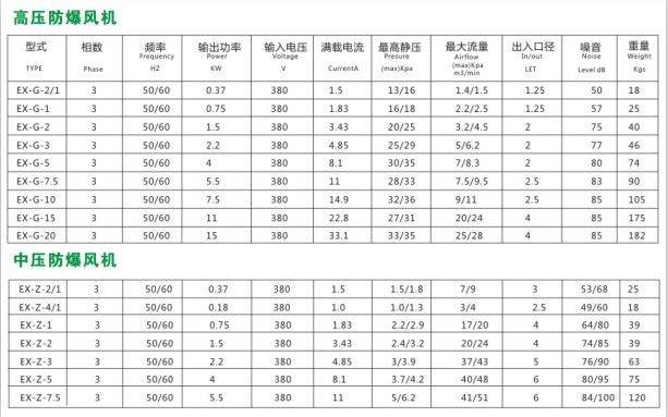 目前广泛应用的低压隔爆型电机产品的基本系列是YB系列隔爆型三相异步电机,它是Y系列(IP44)三相异步电机的派生产品。防爆性能符合GB3836.1—83《爆炸性环境用防爆电气设备通用要求》和GB3836.2—83《爆炸性环境用防爆电气设备隔爆型电气设备“d”》的规定;电机功率范围为O.55—200kW,相对应的机座号范围是机座中心高为80—315nun;防爆标志为dI、dIIAT4、dIIBT4,分别适用于煤矿井下固定式设备或工厂IIA、IIB级,温度组别为T1—T4组的可燃性气体或蒸气与空气形成的爆炸性混合物的场所;主体外壳防护等级为IP44,也可制成IP%4,接线盒防护等级为IP54;额定频率为50Hz,额定电压为380、1660、1140、380/660、660/140V;电机绝缘等级为F级,但按B级考核定子绕组的温升,具有较大的温升裕度。在风机行业均为低压隔爆型三相异步电机派生系列的风机YBF系列(机座中心高为63—160mm)