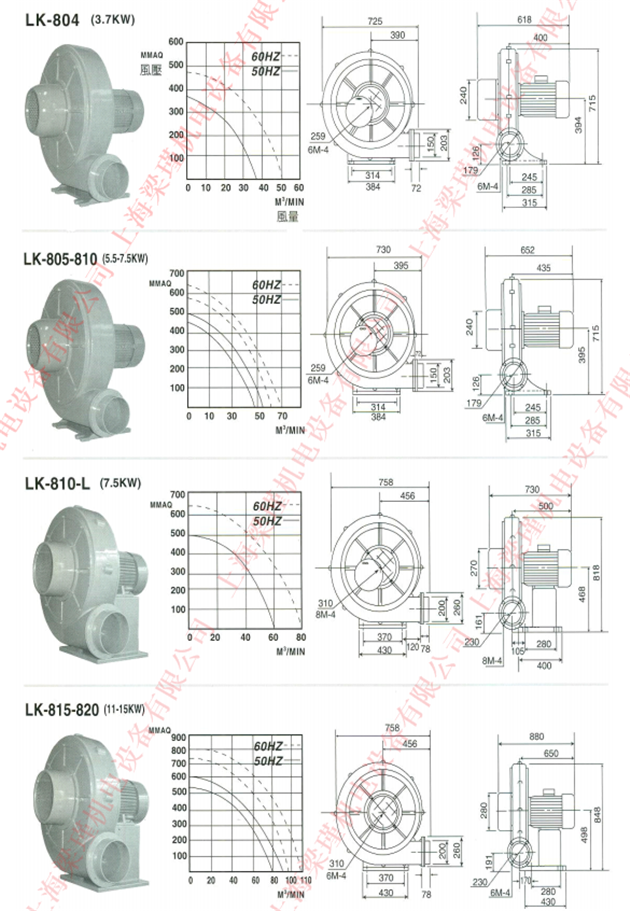 LK-801: 0.75 KW 、LK-802: 1.5 KW 、LK-803: 2.2 KW 、LK-804: 3.7 KW 、LK-805-810: 5.5-7.5 KW 、LK-810-L: 7.5 KW 、LK-815-820: 11-15 KW