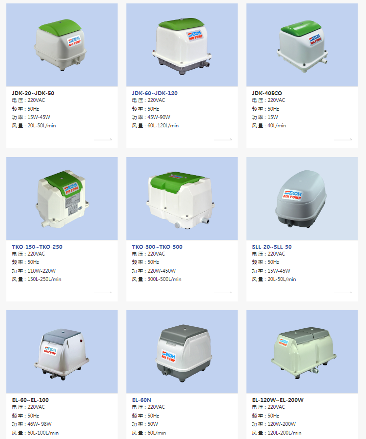 优点 Advantages用途 Applications无需机油 Comdletely Oil free污水处理净化槽Waste Water Treatment Septic Tank低噪音,低电耗,低振动 Very little pulsation,Low noise水产养殖、观赏鱼等增氧用紧凑轻便结构 Compact and light constructionAdding oxygen for breeding beach,ornamental fish, etc.容易保养 Low maintenance气泡浴池Bubble Bath吸排两用 Pressure&vacuum Type臭氧产生、移动厕所 Producing OzoneMobile Restroom高可靠性的自动开关配置机器空气源(空气冷却器,喷墨打印机) High quality auto-stopper inclusiveAir source for machine (air cooler, inkiet printer空气悬浮连接,低振动 Air Susension-style connection真空产生用(真空吸笔) Producing vaccum(vacuum suction pen)散热好,使用长寿命按摩器 Air massagerHigh heat dissipation, long life expectancy健康用(防) 低损耗的空气回路,省电Health care equipment(anti bed sore mattress) Low Dressure loss Air circuit实验室仪器 Laboratory equipment