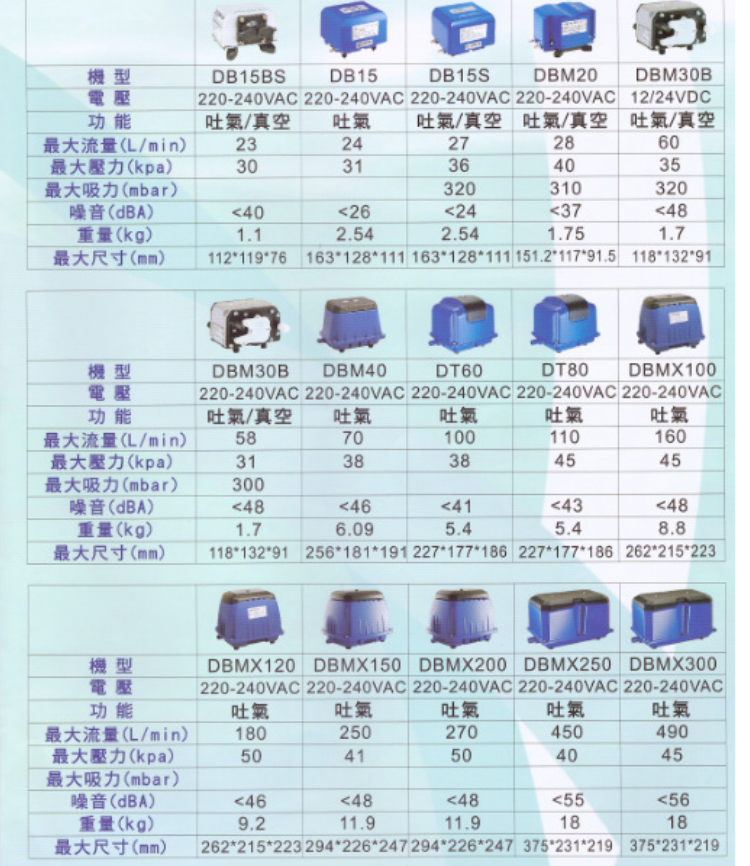 应用范围:(气垫床,按摩椅等)、废水处理(净化槽,移动厕所,曝气机)、印刷机械、纺织机械、水族馆、鱼塘、养殖场、缓冲包装机械 等。