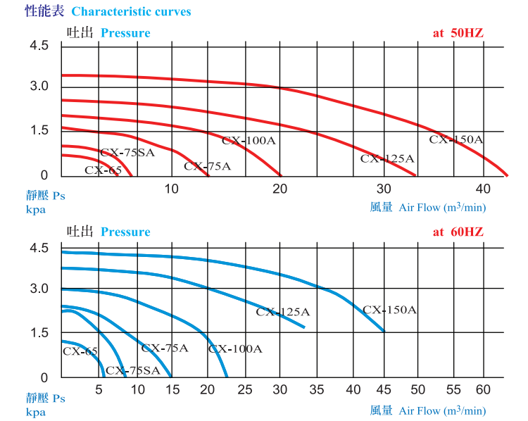 2、根据计算出来的压力和流量,在曲线图上找到同时满足压力和流量对应的工作点以上的工作曲线;然后根据工作曲线选择高压风机型号!
